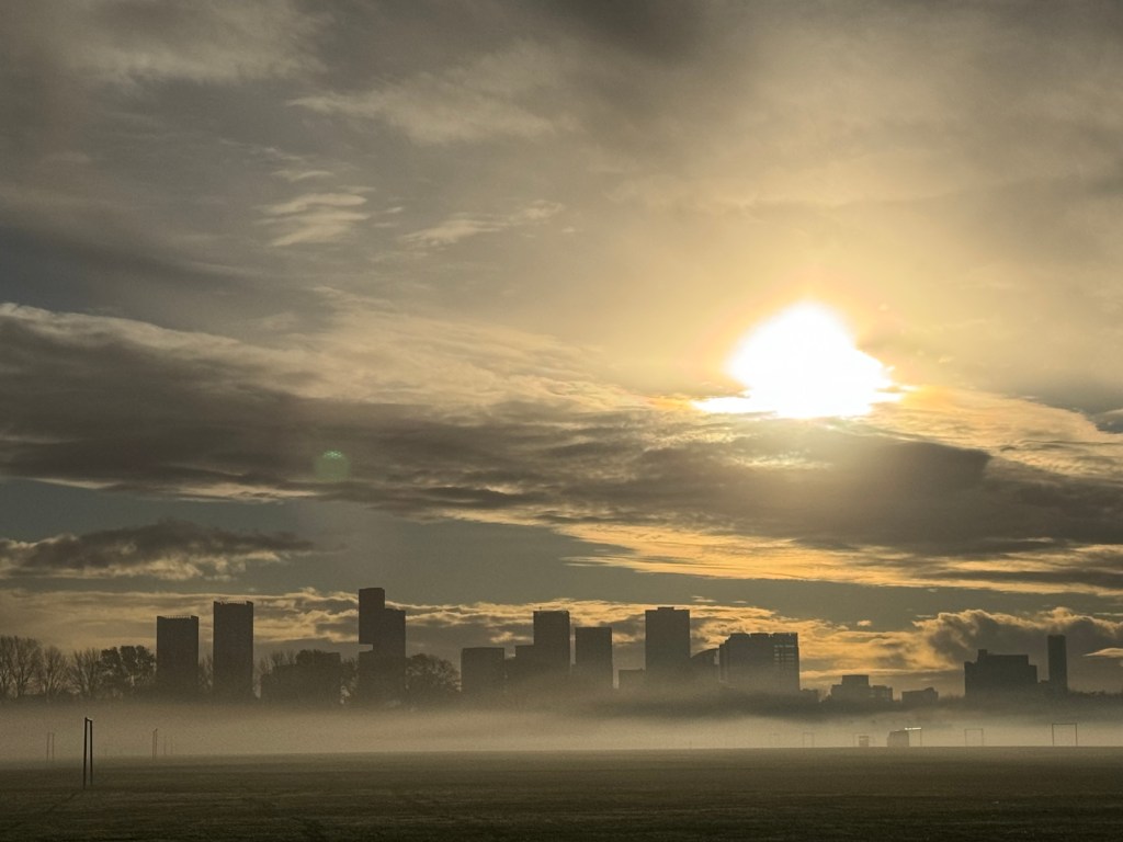 (This is the view of Stratford from Hackney Marshes this morning. Just a nice picture. But also, perhaps, something about mists clearing)
